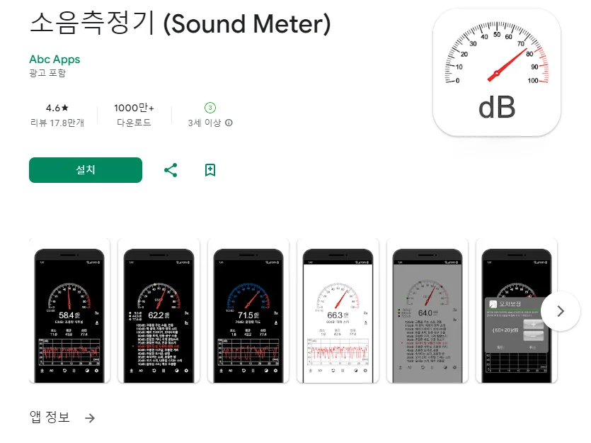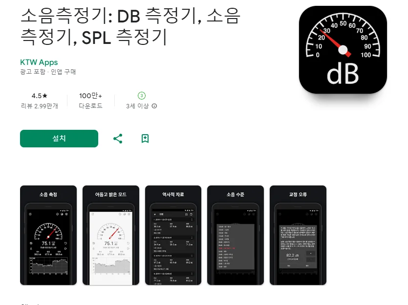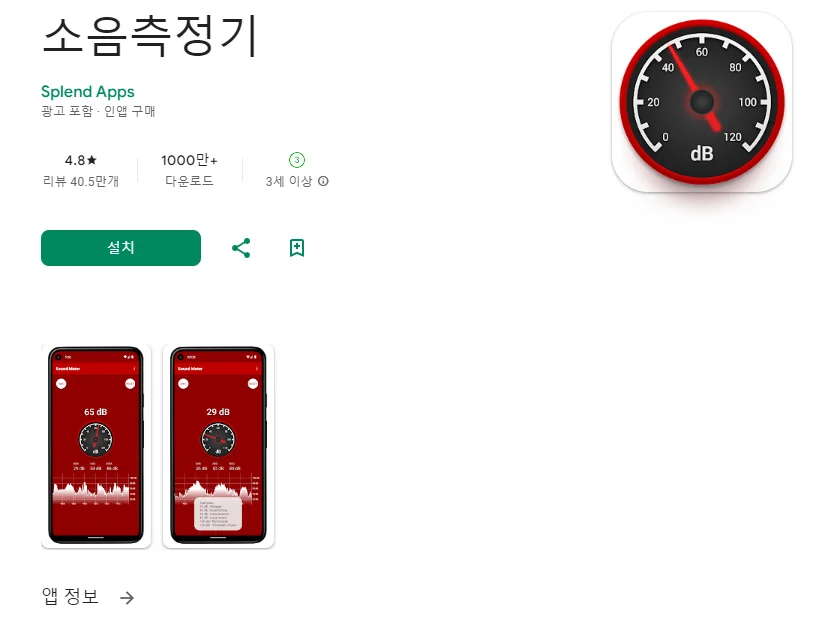 이 어플은 구글플레이스토어에서 "소음 측정기"로 검색했을때 4번째로 나오는 어플입니다. 아래는 소음측정기: DB 측정기, 소음 측정기, SPL 측정기 어플에 대한 자세한 설명이니 참고하세요.