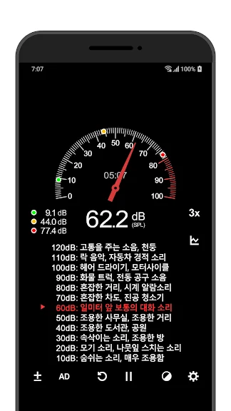 소음측정기 (Sound Meter) 어플에 대한 스크린샷 정보가 필요하시다면 아래 이미지를 참고하시기 바랍니다.
